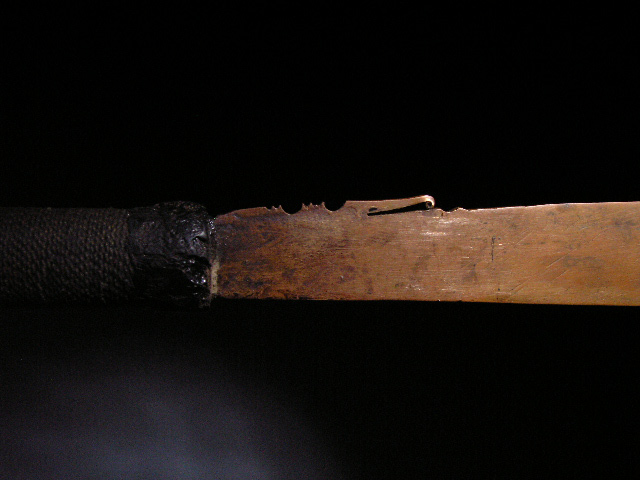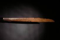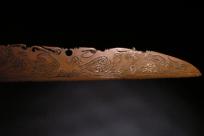 A very rare early copper ceremonial mandau, completely carved on one side of the blade with tin inlay, from West Kalimantan, Kayan people. Antler hilt carved with dragon, sprit of a trophy head and Aso motif. Blade features 4 dragons and a Hornbill design, wood scabbard with fine rattan binding. I have only ever seen one other reference (brass blade) in the book Iban Art by Michael Heppell Pg 129.