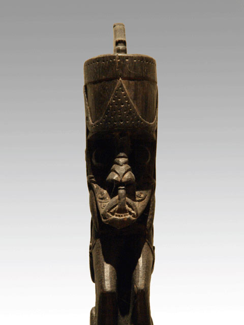A modang staff carved with a spirit figure reverse 2 monkeys. A headress decorated with triangles filled with dots, a distinctive feature in modang carvings,the rhombic mouth another.. A pierced loop sits above the headress and is for the attachment of feathers . This piece is used for the Hudoq ritual for commence and harvesting of padi. It is usually held by the Hudoq leader during the ritual who wears the mask od the Rhino, Spirit of the land.