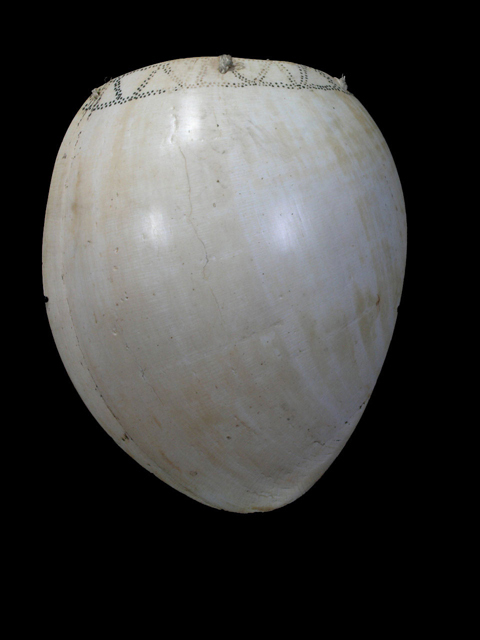 This superb bailer shell also called "Gam" is from mendi in the Southern Highlands, worn as a pectoral adornment by men and women during sing sings. Considered scarcer than kina shells, one bailer shells was worth one pig or one kina shell, In 1934 it was worth 2 pigs. It was also used as bride price. The larger the shell, the more prestigeous . It is in it's simplistic form, a work of art with dotwork design on the top of sell in a band of zig zags. Sold with a custom mounted stand.
