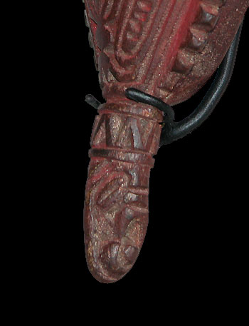 Middle Sepik River , New Guinea. Ex Mike Auliso .. This diminutive elongated mask is presented on a custom metal display stand and features IMPRESSIVE high quality carving with clan motifs. It may have adorned a net bag at one time? The septum is pierced with the remains of some attached bush string. In addition, the top knob-like finial and each side of the mask is pierced. Its loveliest feature is the relief-carved Crocodile on the forehead. The projecting chin has a carefully carved ancestor spirit face. Much of its red ochre pigment is still intact. A one-of-a-kind piece.