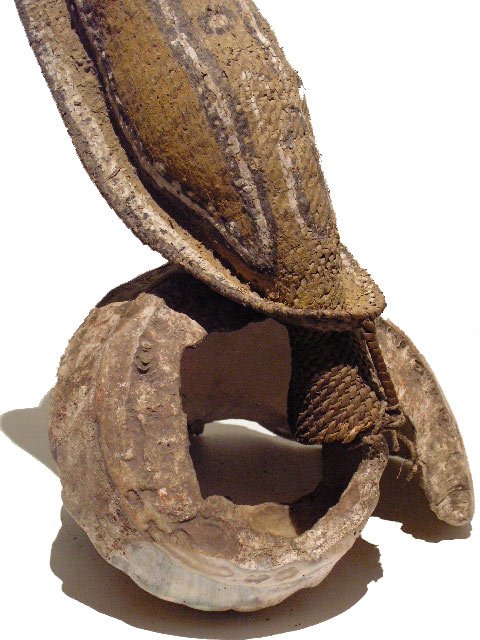 A woven mask colored by ochre, fixed to a turbo shell. Used as a bride price between families.This piece has a wooden birds head attached to the top with protruding eyes.Uncommon form is known locally as the "taro" shape. From the Boiken people in the Yangoro Area.